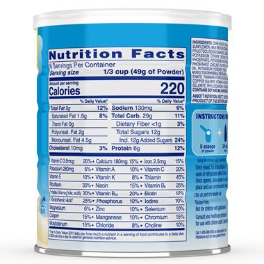 Less than 0.5% of: Natural & Artificial Flavor, Cellulose Gel, Potassium Chloride, Magnesium Phosphate, Calcium Phosphate, Potassium Citrate, Tuna Oil, Calcium Carbonate, Potassium Phosphate, Choline Chloride, Ascorbic Acid, Monoglycerides, Soy Lecithin, Cellulose Gum, Salt, Carrageenan, Potassium Hydroxide, Inositol, Taurine, Stevia Leaf Extract, Ferrous Sulfate, Monk Fruit Extract, dl-Alpha-Tocopheryl Acetate, L-Carnitine, Zinc Sulfate, Calcium Pantothenate, Niacinamide, Manganese Sulfate, Thiamine Hydrochloride, Pyridoxine Hydrochloride, Riboflavin, Lutein, Copper Sulfate, Vitamin A Palmitate, Folic Acid, Chromium Chloride, Biotin, Potassium Iodide, Sodium Selenate, Sodium Molybdate, Phylloquinone, Vitamin D3, and Vitamin B12. Save . Comment cet aliment s'intgre-t-il vos objectifs quotidiens ? A product with label information last recorded more than a year ago is marked with an * identifying it as an older product. No use of any Abbott trademark, trade name, or trade dress in this site may be made without the prior written authorization of Abbott, except to identify the product or services of the company. Deliver To:, NESTLE TOLL HOUSE Butterscotch Chips 11 oz. Free Shipping on Orders Over $35. pediasure