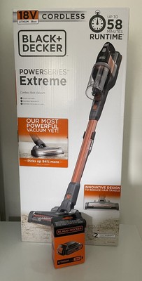POWERSERIES Extreme Cordless Stick Vacuum Cleaner, POWERSERIES EXTREME Cordless Stick Vacuum Replacement Filter, 3X Cleaning System designed for multi-surface clean up, multi-debris pick up, and an anti-tangle brush bar, Twist to clean: built-in filter cleaner provides up to twice the suction, Removable battery for convenient charging in or out of the vacuum, 3-speed control for cleaning hard floors, area rugs, and carpet, Self-standing design - no leaning necessary, Front-facing dustbin gives quick access when emptying, and allows vacuum to lay flat for hard-to-reach areas, Convert to use as hand vacuum for versatile cleaning on stairs, furniture, hard-to-reach areas, and more, Part of the BLACK+DECKER 20V MAX* Battery System, *Maximum initial battery voltage (measured without workload) is 20 volts. Started off good, a bit loud, but still worked. It will be going to landfill coz I dont have the heart to sell this heap of crap to another person. Glad I didn't spend an absolute fortune on it. After only 2 weeks the carpet cleaning head does nothing except shoot things behind it.