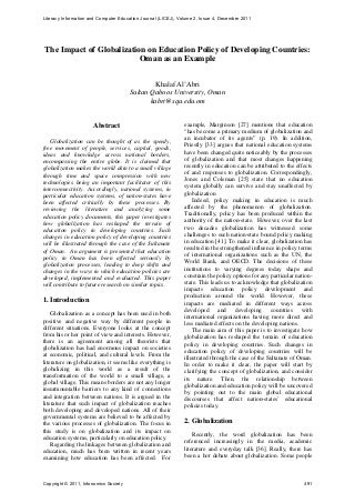 They now have access to a wide variety of information through the internet and that too within seconds. Oxford, Teachers from Fiji go abroad and study in certain countries and when they return to Fiji, they implement the knowledge and skills of that countries education system into Fiji. Globalization has increasingly made learners worldwide more aware of global issues and problems that are changing the face of the world. As a result, the Fiji government has to pay extra money to bring in teachers from overseas countries. The Internet coupled with Netscape, which went public in 1995, was the second flattener. Thomas Friedman said in his book, The World is Flat, that the one ability students should have when leaving college is the ability to, learn how to learn and to constantly absorb, and teach yourself, new ways of doing old things or new ways of doing new things (2007, pg 309). Moreover, globalization led to western universities realizing that there is a great opportunity available in thirdworld countries to open their campuses there. Teachers and education officers who have studied abroad and are now back in Fiji may also implement new techniques or ideas that they have learnt when they were abroad. Wal-Mart is very good at redirecting its products when there is a change in demand. The process began in early-2008, led by the International Engineering Education SIG, and involved CMC members developing a list of competencies derived from representative job descriptions, literature reviews, and other reports. Todays processor does over 20 billion instructions per second. Retrieved from https://graduateway.com/globalization-and-education/, Kerala: Good Human Development Indicators, Globalization And The Effects Of Globalization, Globalization And Impact Of Mcdonalds Globalization Commerce, Globalizations Influence on Conflict in International System, Compare different payment systems used by e-commerce systems, Missouri State Court Systems vs. Texas State Court Systems, A Mothers Influence on her Childs Education, A contrast on online education to on-ground education, Tele-Education Technologies in Distance Education. Home > Books > New Knowledge in a New Era of Globalization, Submitted: October 25th, 2010 Published: August 1st, 2011, Total Chapter Downloads on intechopen.com. 54). Finally, there are some pragmatic strategies to facilitate, encourage, and sustain global-oriented teaching in higher educationapproaches that are adaptable to a variety of disciplines and institutional contexts. Multidisciplinary Approach- Teams were composed of students with different discipline backgrounds, but whose skills, knowledge, and experiences were important to achieve the projects goal. globalization yah According to Freidman, In-Forming is the individual or personal analog to uploading, outsourcing, insourcing, supply-chaining, and offshoring (2007). Language and communication differences- English words have different meaning in different languages so this is an area that can be extremely difficult. education global seleccionar tablero international magazine