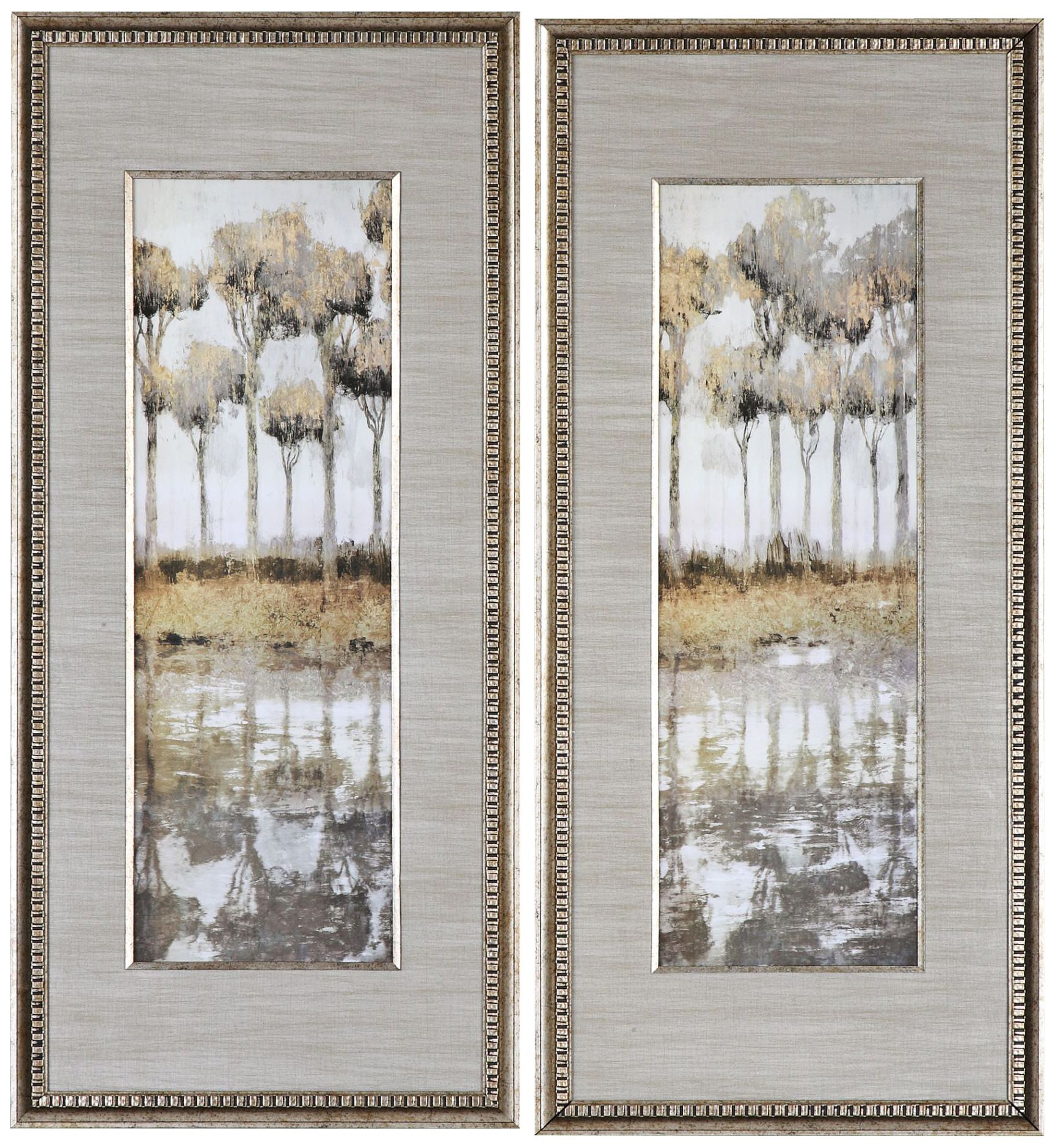 Create calming spaces with art that uses airy, tranquil colors Hand painted forest scene on canvas showcases a watercolor style with soft sage green, yellow and gray tones and a silver gallery frame. Uttermost Rustic Patina Framed Prints, Set/2 | #35366 Hand painted on metal sheets, this contemporary artwork features shades of silver and gold leaf, dark brown, and green.