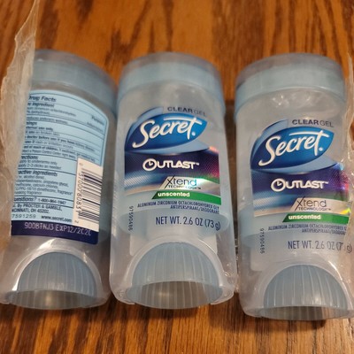 Secret Outlast Technology offers 48-hour odor protection that never stops! Formulated with skin care ingredients, Secret Outlast provides 48 hours of wetness protection and odor control that is gentle on skin. Secret Antiperspirant Deodorant for Women, Unscented, Clear Gel, Outlast Xtend, 2.6 Oz (Pack of 6) (Packaging May Vary) $32.42 ($2.08 / Ounce) (2,783) In Stock. The deodorants are offered in unscented and scented varieties with the scents ranging from refreshingly light to intense. Secret Clinical Strength Clear Gel goes on clear and dries fast, while its Stress Response scent delivers an invigorating citrus aroma all day long. This unscented deodorant will be your ultimate product if you want to get rid of those creamy or stick gel deodorants. Get free shipping at $35 and view promotions and reviews for Secret Outlast Outlast Clear Gel $9.99.